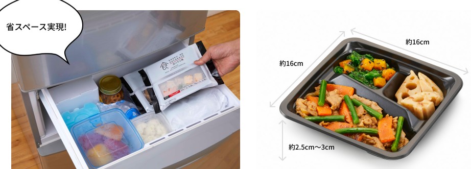 - 一般的な冷凍弁当よりもスリムで、一人暮らしの小さな冷凍庫でもスッキリ収納できます。
