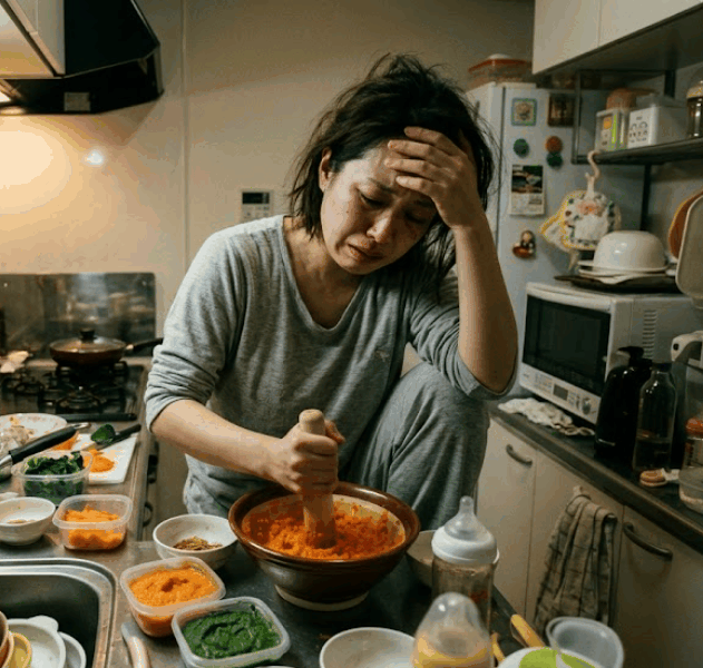 「手作りが愛情」という呪縛にとらわれ、毎晩すり鉢で野菜をすりつぶし、小分けにして冷凍する作業で睡眠時間を削っていました。