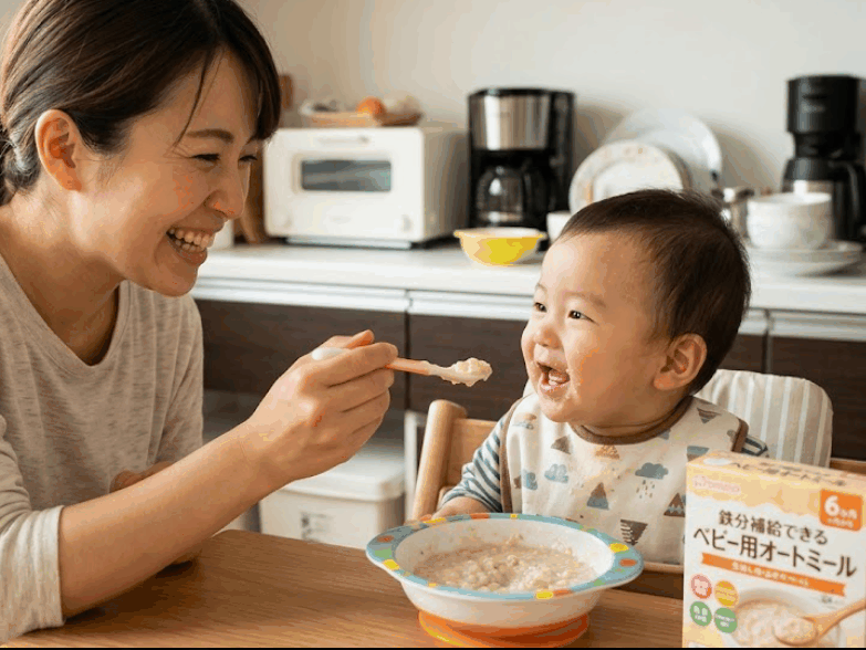 生後6ヶ月を過ぎると不足しがちになる鉄分。ベビー用オートミールなら、ミルクやお湯でふやかすだけで主食が完成し、同時に鉄分も補給できます。調理の手間が一切ないため、忙しい朝の定番メニューに最適です。